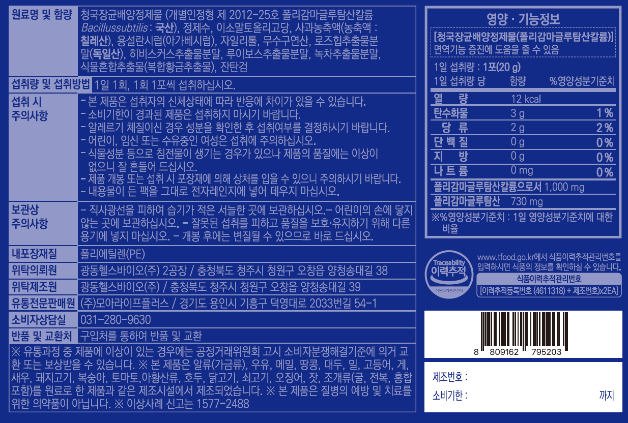 | 기능정보 | [청국장균배양정제물(폴리감마글루탐산칼륨)] 면역기능 증진에 도움을 줄 수 있음 |